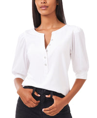 Puff sleeves lend a uniquely beautiful silhouette to this button-front top from Riley & Rae. Approx. model height is 5'9" and she is wearing a size small Approx. 22-1/4" long V-neck; button-front closures Puff sleeves with shirred detail Cotton/rayon/spandex Machine washable Imported