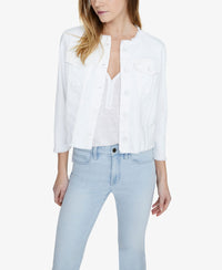 Stylishly distressed with fraying at the edges, this jacket from Sanctuary is in a cute cropped silhouette that updates your casual look. Approx. 20-1/2" long at front; 20" long at back Crewneck; button closure at front Raw edges at collar, cuffs and hem; princess seaming Flap pockets at chest Unlined Cotton/elasterell/spandex Machine washable Imported