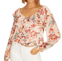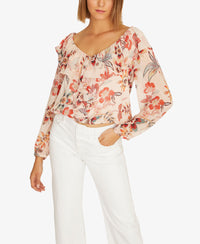 Look and feel elegant when wearing Sanctuary's long sleeve top with its lovely floral-print and flowing ruffle at the neckline. Approx. 21-1/2" long V-neckline Ruffle at neckline Polyester Machine washable Imported Web ID: 8431662