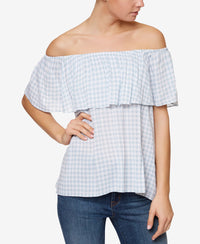 Sanctuary Women's Misha Off-The-Shoulder Flounce Top. This Sanctuary Blouse is guaranteed authentic. It's crafted with 100% Rayon. Off-the-shoulder neckline Flounce overlay Check Print Ruffled Loose fit; hits at hip Machine washable Imported