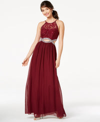 Forever in your heart. Speechless' formal gown makes a lasting impression with a sparkling infinity waist and flowy skirt. Approx. model measurements: height: 5'9-1/2"; bust: 32"; waist: 25"; hips: 34" Exposed back zipper with hook-and-eye closure Long length Halter neckline Adjustable spaghetti straps Sequined lace at bodice; embellished cutouts at waist Molded cups IMPORTANT NOTE: This item arrives with a return tag attached and instructions for removal. Once the tag is removed from the dress, this item cannot be returned. Shell & lining: polyester Hand wash Imported