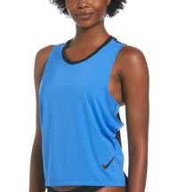 A mesh back adds airy comfort to this Nike tank top, a sporty swim cover-up with a racerback. Hits at low hip Pullover styling; scoop neckline Racerback; logo at left hip Lined Nylon /spandex; mesh: polyester/spandex Machine washable Imported