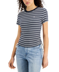 Tommy Jeans updates your favorite striped T-shirt with allover ribbing and ruching at the sides for an adjustable feminine fit. Approx. model height is 5'10" and she is wearing a size small Fitted; approx. 21-1/4" long Crewneck Logo tape at side ruching Rayon/spandex Machine washable Imported
