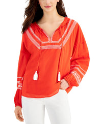 Opt for a breezy boho vibe with this peasant top from Style & Co. Swingy tassel ties and soft embroidery complete the flowy look. Approx. model measurements: height: 5'10"; bust: 34"; waist: 25"; hips: 35" Relaxed fit; approx. 25" long New and improved fit; please reference size chart Split neckline with tassel ties Embroidered All cotton Machine washable Imported