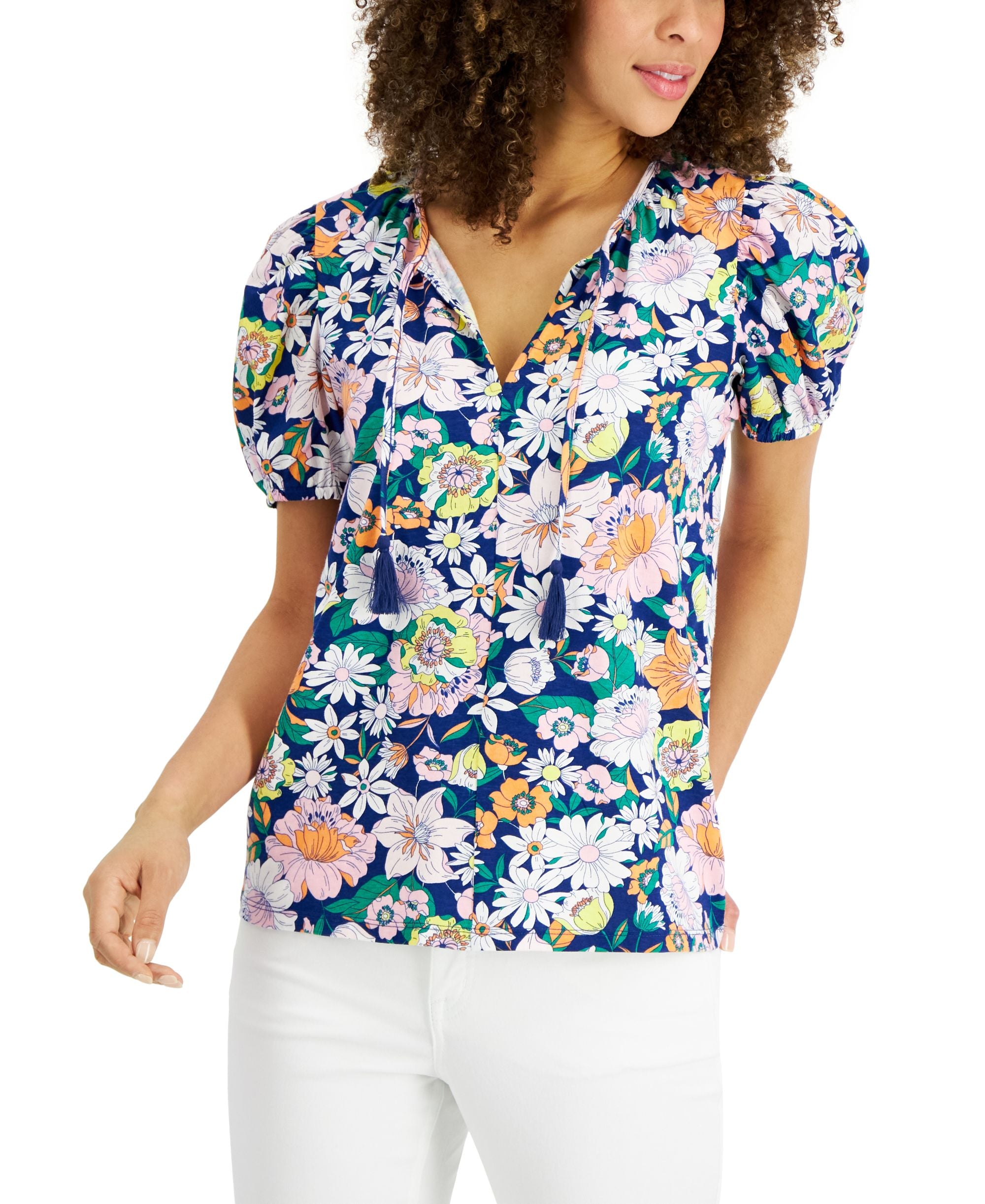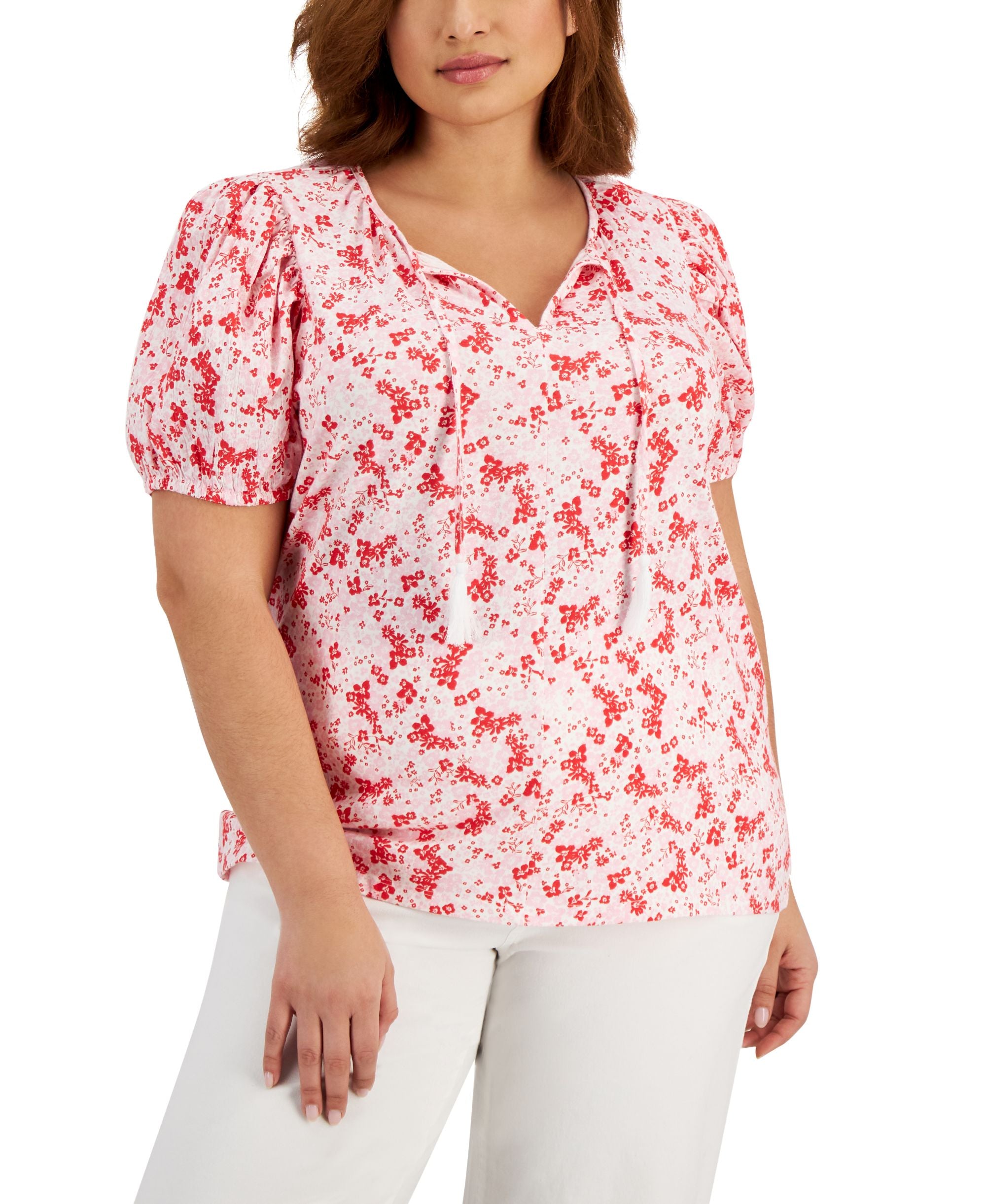 Hit the mark in this plus-size peasant top from Style & Co, designed with tassels and puffed short sleeves.