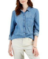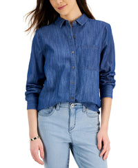 A tried and true look, Style & Co's cotton chambray boyfriend shirt is a comfortable mixable match for countless casual outfits. Approx. model measurements: height: 5'10"; bust: 31-1/2"; waist: 24"; hips: 35" Relaxed fit; approx. 29-1/2" long Due to generous sizing, we suggest sizing down for the perfect fit Point collar; button front closures Patch pocket at left chest; box pleat below back yoke; shirttail hemline Long sleeves with buttoned cuffs All cotton Machine washable Imported , Web ID: 13403197
