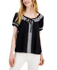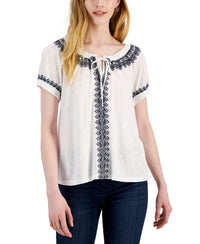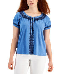 Style & Co Womens Embroidered Puff Sleeve Blouse