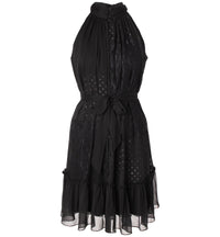 Introducing your new party outfit: Taylor's lace-trim halter dress, featuring a flounce hem. Approx. 37-1/4" long from center back neck to hem. Length is based on size 8 and varies 1/2" between sizes Runs true to size; order your normal size Fitted through the chest and waist; structured A-line skirt sits slightly over hips Halter neckline; A-line silhouette Front button placket; hidden back zipper Lace and clip-dot trim throughout; self-tie belt at waist; flounce hem Lined Polyester Hand wash Imported Web ID: 14920589