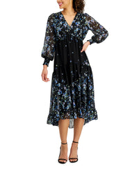 Twirl the night away in this dress from Taylor, featured in delicate florals and finished with a charming ruffle at the hem. Approx. 52-1/2" long from center back neck to hem. Length is based on size 8 and varies 1/2" between sizes Chiffon: Smooth, sheer woven fabric V-neck Hook and bar closure at keyhole back Long sleeves with smocked cuffs Ruffle trim at hem Lined Shell/lining: polyester Hand wash Imported