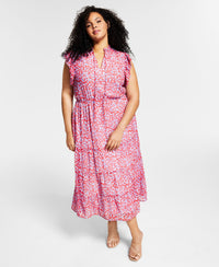 Fresh and fabulous, this plus size dress from Black Tape features a gorgeous print and a tie detail at the waist. Approx. 49" long from center back neck to hem Fitted through the chest and arms; sits away from the body through the waist and hips Keyhole neckline with tie; Maxi shift silhouette Pullover styling Drawstring tie detail at waist; tiered skirt Lined Rayon/Lurex® metallic threads; lining: cotton Machine washable Imported