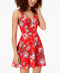 Make a playful exit in this strappy open-back dress from Trixxi, a sleeveless pick styled with a gorgeous floral print on a fierce fit & flare silhouette. Approx. model height is 5'9-1/2" and she is wearing a size medium Short length; Fit & flare silhouette V-neckline; back zipper closure Open back with crisscross straps Double spaghetti straps Shell: polyester/spandex; lining: polyester Machine washable Imported
