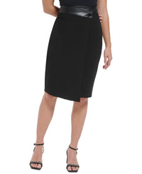 Sleek, sophisticated, polished- this pencil skirt by Calvin Klein has it all. The wrap design elevates the classic pencil silhouette, while the faux leather waistband lends a dynamic edge to this workweek essential. Approx. length: 25" Hidden zipper at center back Lined Shell: rayon/reprocessed polyester/polyester/spandex; lining: polyester; faux leather trim: polyurethane Dry clean Imported