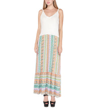 Perfect for warmer weather, Black Tape's breezy maxi dress combines classic crochet and a mix of printed stripes for cool boho-chic vibes. Approx. 48-3/5" long from center back neck to hem V-neck; Maxi silhouette Pullover styling Crochet bodice; tiered skirt Unlined Top: cotton; skirt: rayon Hand wash Imported