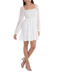 Chiffon mini dress from 1.STATE. The smocked bodice and ruffle hem express a fun and flirty look. Approx. model height is 5'7" and she is wearing size small Approx. 26-1/2" long from center back neck to hem Square neckline Pullover styling Puff sleeves with smocked cuffs Smocked bodice; ruffled hem Shell: polyester; lining: polyester Machine washable Imported Web ID: 18359671