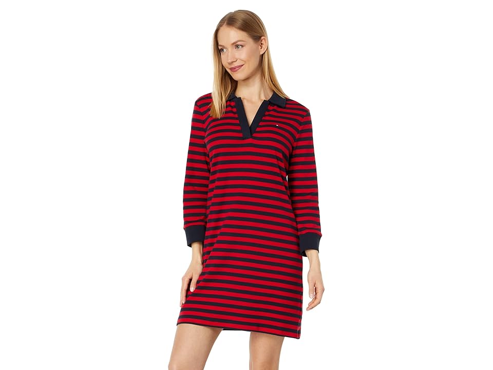 Your new favorite casual wardrobe addition is here with Tommy Hilfiger's striped, 3/4-sleeve dress featuring an embroidered logo at left chest.