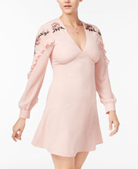 Pretty ruffles trim the romantic bishop sleeves of XOXO's flirty dress. Colorful embroidery trails down the sleeves from each shoulder, upping this look's feminine vibes. Back zipper closure Approximate model measurements: height: 5' 9-1/2"; bust: 32"; waist: 25"; hips: 34" Short length V-neckline Long bishop sleeves with ruffle detail Embroidered at shoulders and sleeves Body and lining: polyester/spandex Hand wash Imported Web ID: 4858246